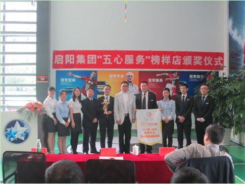 ??? 2014年4月22日,,,,,,,,威廉希尔·(William Hill)中文官方网站第一季度“五心折务”模范店颁奖仪式在锦江园区盛大举行。。。。。。。集团陈斌总裁、王麟副总裁、治理公司各部长及成都地区分公司总司理出席了此次颁奖仪式,,,,,,,,威廉希尔·(William Hill)中文官方网站春风日产启辰专营店首次夺得“五心折务”模范店声誉。。。。。。。