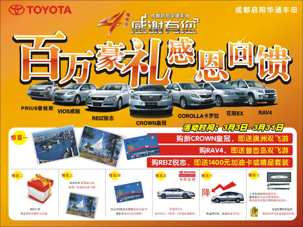 为了庆祝威廉希尔·(William Hill)中文官方网站华通丰田周围年,,,,,,,,在3月3日至3月31日时代,,,,,,,,凡到威廉希尔·(William Hill)中文官方网站华通丰田购置全新CROWN皇冠,,,,,,,,就送价值万元澳洲双飞8日游;;;;;购RAV4,,,,,,,,送泰国普吉岛双飞游。。。。。。别的,,,,,,,,到店订任一款车型,,,,,,,,都将获赠超值豪华生日大礼包,,,,,,,,内含950元交强险、多种原装精品等,,,,,,,,以上礼物3月送完,,,,,,,,以后不再赠予。。。。。。