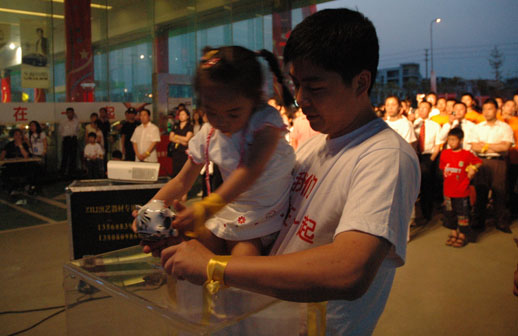 活动蹒跚的孩子让母亲抱着捐上了自己的零用钱