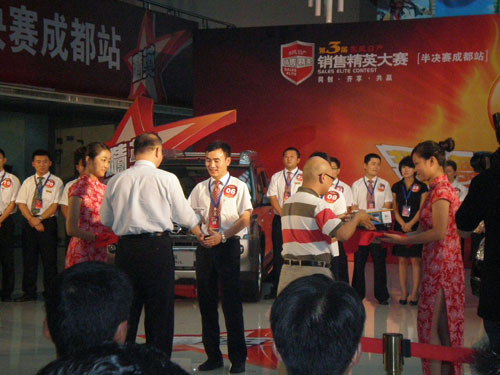 ??? 2009年8月20—21日,,,,,,春风日产第三届天下销售精英大赛半决赛在成都正式拉开序幕。。。。。。。。威廉希尔·(William Hill)中文官方网站日产销售部销售照料杨震威经由强烈竞争,,,,,,从28名参赛选手中脱颖而出,,,,,,获得成都赛区季军和最具潜力选手两大殊荣,,,,,,乐成晋级天下20强,,,,,,并将于9月前往广东加入在花都举行的天下总决赛。。。。。。。。